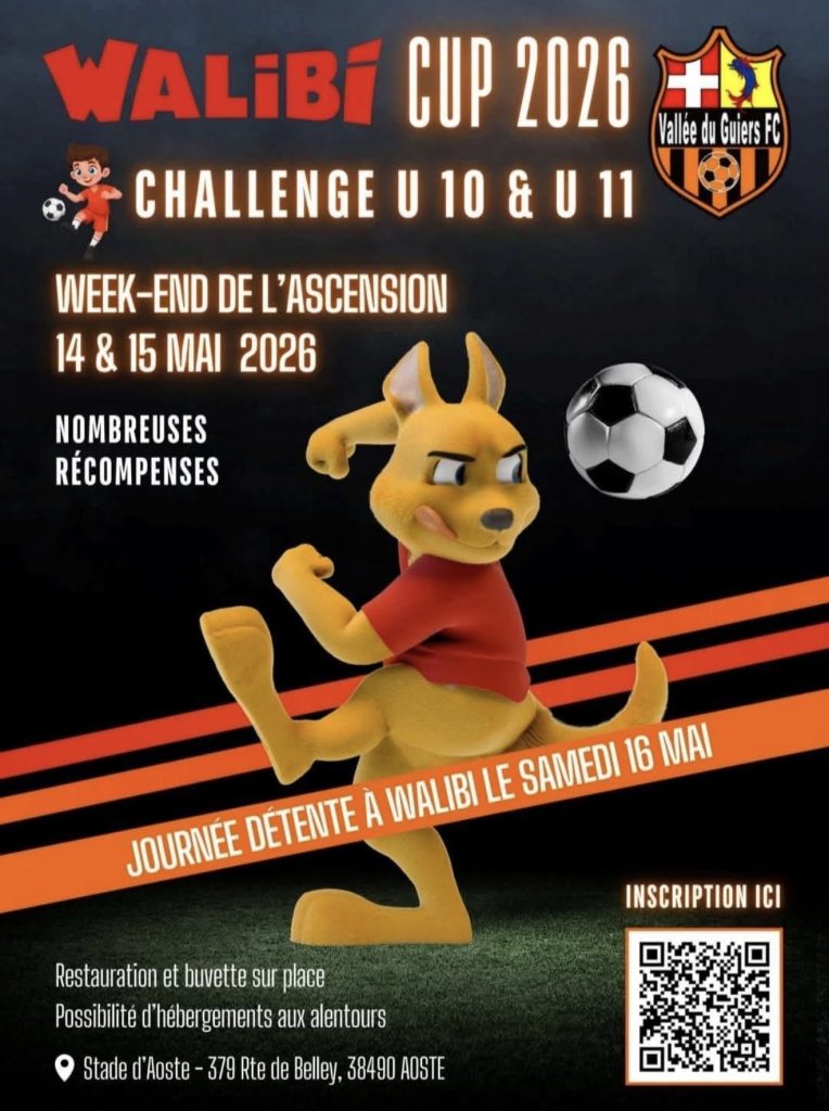 Le Vallée du Guiers FC organise la 1ère édition de la Walibi Cup du 14 au 16 mai 2026 à l’occasion du week-end de l’Ascension ⚽🎉 Un grand challenge festif et sportif, avec en point d’orgue une journée détente à Walibi le samedi 16 mai 🎢🔥 📍 Région Auvergne-Rhône-Alpes 📌 Département Isère (38) 🏟️ Adresse complète Stade d’Aoste 379 Route de Belley 38490 Aoste 👥 Catégories U10 & U11 🍔 Infos pratiques • Restauration et buvette sur place • Possibilité d’hébergements aux alentours • Inscription via le QR Code présent sur l’affiche 📞 Contact organisateur Vallée du Guiers FC 06 82 25 03 12 ✨ Un tournoi unique mêlant passion du football, convivialité et moments inoubliables dans un cadre exceptionnel !