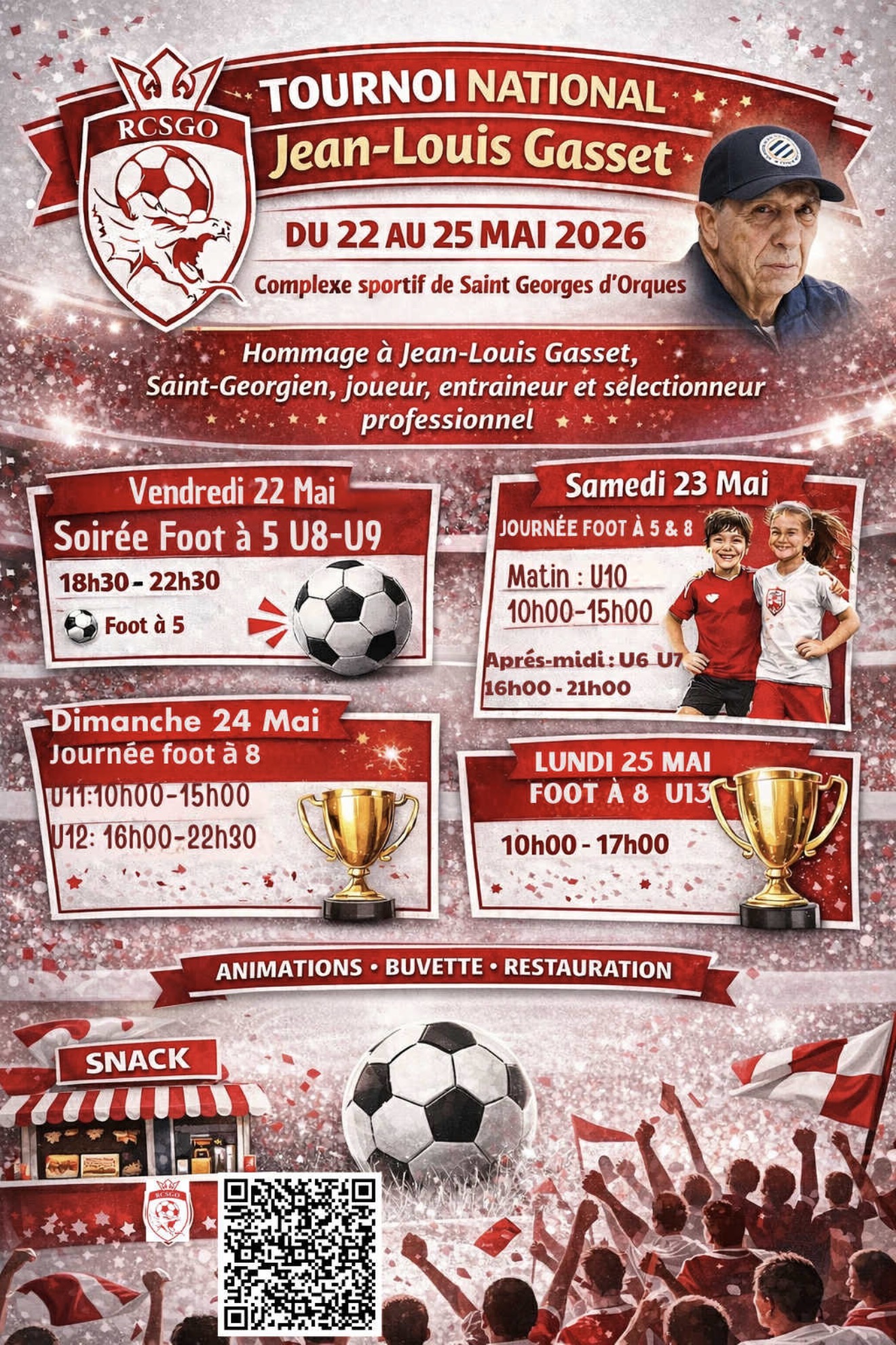 TOURNOI NATIONAL JEAN-LOUIS GASSET 📅 Dates : du 22 au 25 mai 2026 📍 Lieu : Complexe sportif de Saint-Georges d’Orques 📮 Adresse complète : Complexe sportif – 34680 Saint-Georges-d’Orques 🏙️ Département : Hérault (34) 🌍 Région : Occitanie 🏟️ Organisateur : RCSGO (Racing Club Saint-Georges d’Orques) 🎖️ Tournoi en hommage à Jean-Louis Gasset, Saint-Georgien, joueur, entraîneur et sélectionneur professionnel. ⚽ PROGRAMME & CATÉGORIES 🔴 Vendredi 22 mai 2026 Soirée Foot à 5 Catégories : U8 – U9 Horaires : 18h30 – 22h30 🔴 Samedi 23 mai 2026 Journée Foot à 5 & Foot à 8 U10 : 10h00 – 15h00 U6 – U7 : 16h00 – 21h00 🔴 Dimanche 24 mai 2026 Journée Foot à 8 U11 : 10h00 – 15h00 U12 : 16h00 – 22h30 🔴 Lundi 25 mai 2026 Foot à 8 U13 : 10h00 – 17h00 🎉 Animations – Buvette – Restauration sur place 📞 Contact : Non précisé sur l’affiche (voir QR code ou contacter le RCSGO via leurs réseaux officiels).