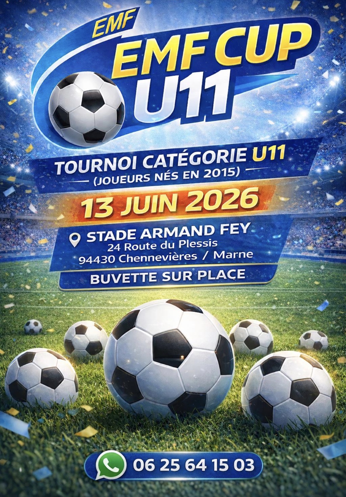 Préparez-vous pour une journée 100% football, passion et fair-play ! 💙💛 L’EMF CUP U11 arrive pour rassembler les jeunes talents dans une ambiance festive et compétitive ! 🏆 Catégorie U11 👦 Joueurs nés en 2015 📅 Date : Samedi 13 juin 2026 📍 Lieu : Stade Armand Fey 📌 Adresse : 24 Route du Plessis, 94430 Chennevières-sur-Marne Une journée exceptionnelle attend les équipes avec : ⚽ Des matchs intenses et dynamiques 🤝 Du fair-play et du respect 🎉 Une ambiance conviviale et familiale 🥤 Buvette sur place pour se restaurer toute la journée Que vous soyez joueur, éducateur, parent ou supporter, venez vivre une expérience sportive inoubliable ! 🌟 📞 Informations et inscriptions : 06 25 64 15 03 (WhatsApp disponible) 📢 Les places sont limitées – Réservez dès maintenant et venez tenter de décrocher le trophée EMF CUP 2026 ! 🏆🔥 Rendez-vous le 13 juin pour faire vibrer le Stade Armand Fey au rythme du football des champions de demain ! ⚽💫