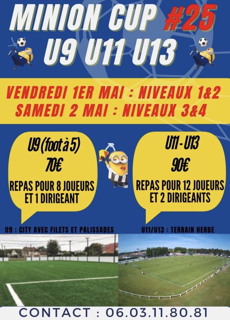 🎉 Cette année, la Minion Cup fête sa 25ᵉ édition dans les Hauts-de-France, au cœur du Pas-de-Calais (62) ! Depuis 25 ans, c’est du football, du plaisir, une organisation soignée et surtout… 👉 25 ans d’une grande famille de bénévoles toujours présents, motivés et passionnés 💪💛💙 Année après année, le Groupement Cucq Saint-Josse met tout son cœur dans ce tournoi devenu un rendez-vous incontournable pour les clubs de la région ⚽🔥 📅 Vendredi 1er mai : Niveaux 1 & 2 📅 Samedi 2 mai : Niveaux 3 & 4 👦 Catégories : U9 – U11 – U13 📍 U9 : City avec filets et palissades 📍 U11 / U13 : Terrain herbe ⚠️ Les inscriptions sont ouvertes ! ➡️ Ne manquez pas cette édition spéciale du 25ᵉ anniversaire, synonyme de plaisir, de qualité et de convivialité ! 📞 Infos & inscriptions : 06.03.11.80.81 💙 Merci à tous nos bénévoles, anciens et nouveaux, qui font de ce tournoi un moment unique chaque année 🙏