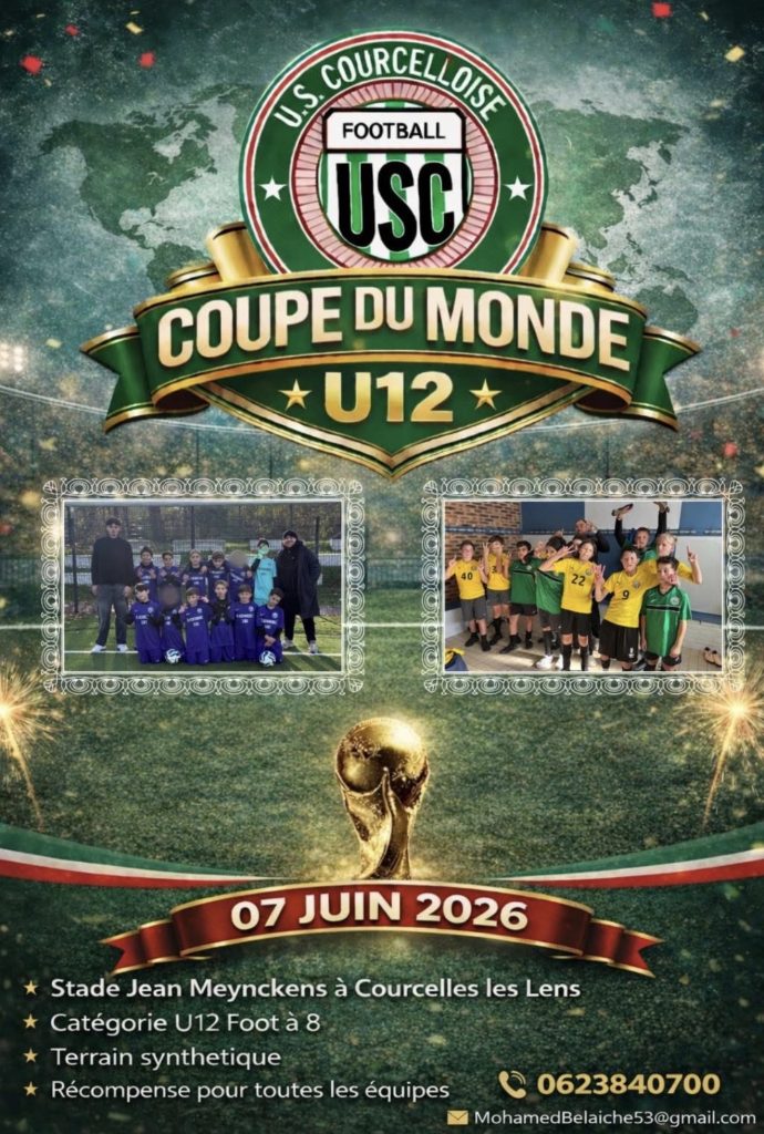 L’U.S. Courcelloise organise la Coupe du Monde U12 le dimanche 7 juin 2026 🔥 Un tournoi festif et compétitif avec récompenses pour toutes les équipes 🥇🎉 📅 Date Dimanche 7 juin 2026 📍 Lieu Stade Jean Meynckens 📌 Adresse complète : Stade Jean Meynckens, 62970 Courcelles-lès-Lens 🗺️ Région : Hauts-de-France 🏢 Département : Pas-de-Calais (62) ⚽ Catégorie U12 – Foot à 8 🌱 Terrain Synthétique 🎁 Récompenses Lots et récompenses pour toutes les équipes participantes 👤 Organisateur U.S. Courcelloise 📞 Contact 06 23 84 07 00 📧 MohamedBelaiche53@gmail.com 🔥 Une belle journée de football en perspective dans une ambiance conviviale et festive !