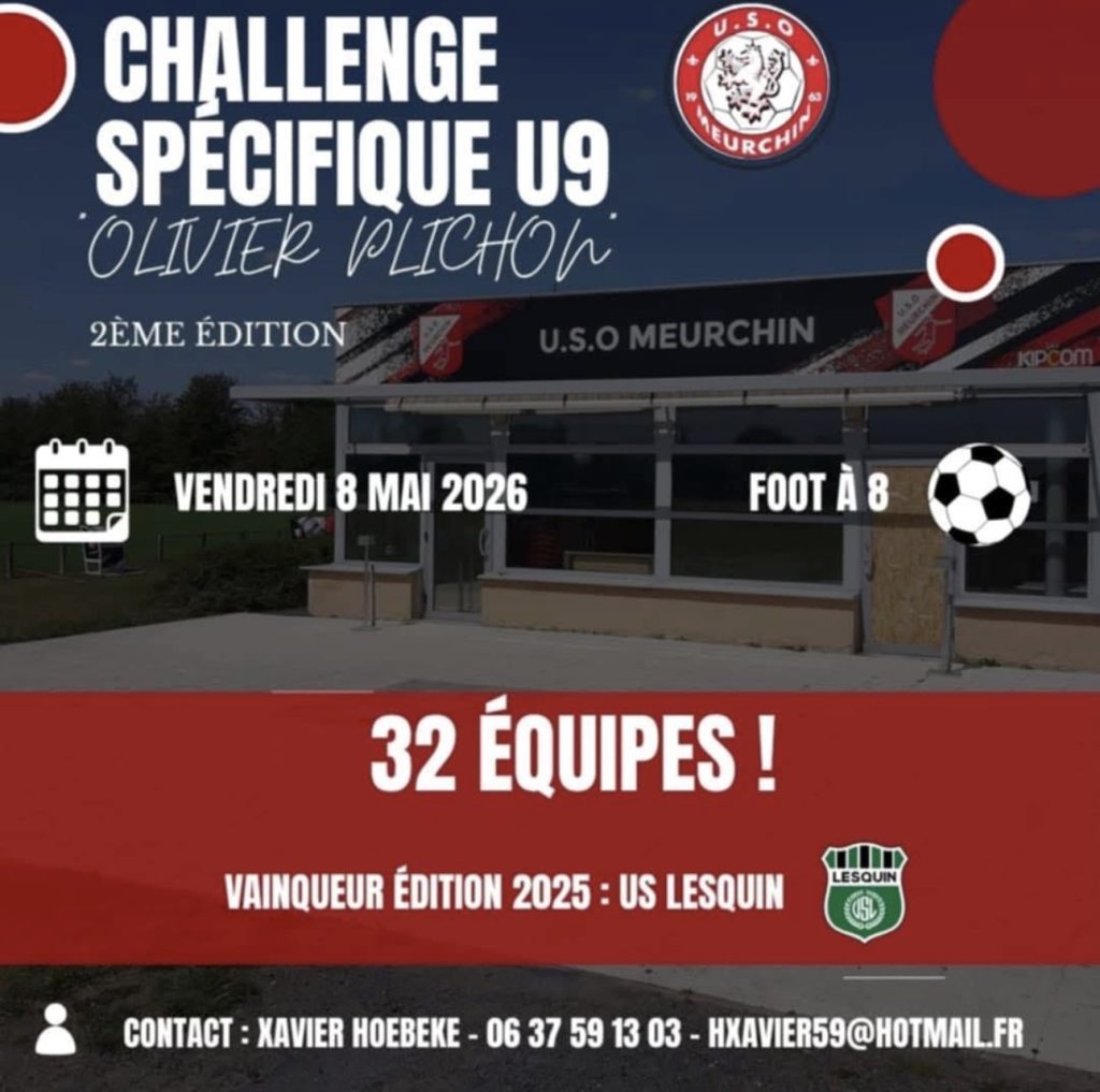 Le Challenge Olivier Plichon revient pour sa 2ᵉ édition et promet une ambiance exceptionnelle ! 📅 8 mai 2026 📍 Meurchin – Pas-de-Calais (Hauts-de-France) ⚽ Un tournoi U9 Foot à 8 rassemblant 32 équipes prêtes à tout donner ! Une occasion unique pour les jeunes joueurs de vivre une expérience intense, conviviale et pleine d’émotions. Les tribunes vibrent, les talents s’affirment, et l’esprit sportif est au rendez-vous du premier au dernier match ! 🏆 L’US Lesquin, vainqueur de la première édition, remet son titre en jeu… Et si votre équipe créait la surprise cette année ? 📞 Infos & inscriptions : Xavier Hoebeke — 06 37 59 13 03 📧 hxavier59@hotmail.fr
