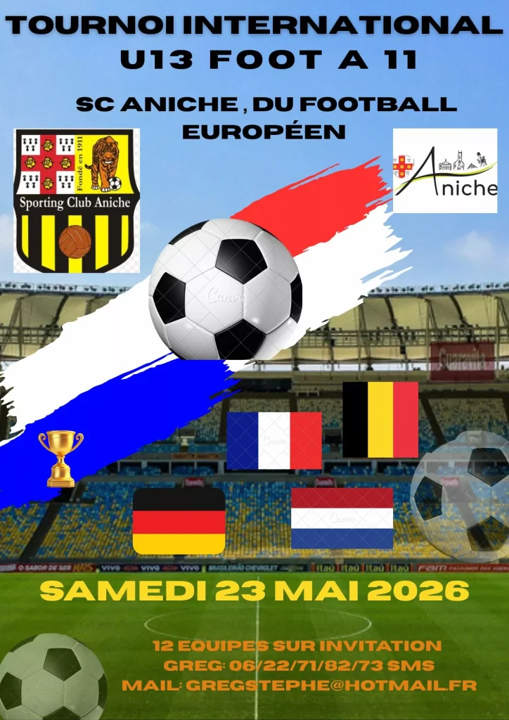 ⚽ Tournoi International U13 – SC Aniche Le Sporting Club d’Aniche organise un grand tournoi international U13 le samedi 23 mai 2026 !Une journée dédiée au football européen, à la compétition et au partage entre jeunes talents venus de plusieurs pays. 🌍 📅 Date : Samedi 23 mai 2026📍 Lieu : Aniche (59)👥 Catégorie : U13 – Foot à 11🌍 12 équipes sur invitation🇫🇷 🇧🇪 🇩🇪 🇳🇱 France – Belgique – Allemagne – Pays-Bas🏆 Ambiance conviviale et fair-play garanti 📩 Contact :Greg – 06 22 71 82 73 (SMS)✉️ gregstephe@hotmail.fr