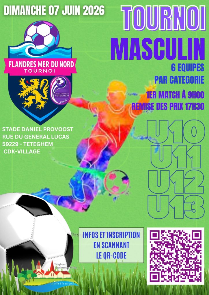 L’US Téteghem (Nord de la France, bord de mer) organise son tournoi annuel de football à 8 le dimanche 7 juin 2026. 📍 Lieu : Stade Daniel Provoost, Rue du Général Lucas, 59229 Téteghem, CDK-Village 👥 Organisation : Flandres Mer du Nord Tournoi 📝 Détails des catégories et horaires Tournoi limité à 6 équipes par catégorie – dépêchez-vous ! ⏳ ⚽ FOOT À 8 (Petit terrain) Catégories : U10-U11-U12-U13 Début du 1er match : 9h00 Remise des prix : 17h30 🎉 📲 Inscriptions 🧾70€ de caution Scannez le QR Code ou remplissez le formulaire : Formulaire d’inscription 📞 Contact David Evrard Téléphone : 06 19 79 27 69 Email : lecalamard@gmail.com Ne manquez pas cette journée , pleine de plaisir et de fair-play ! ⚽💖
