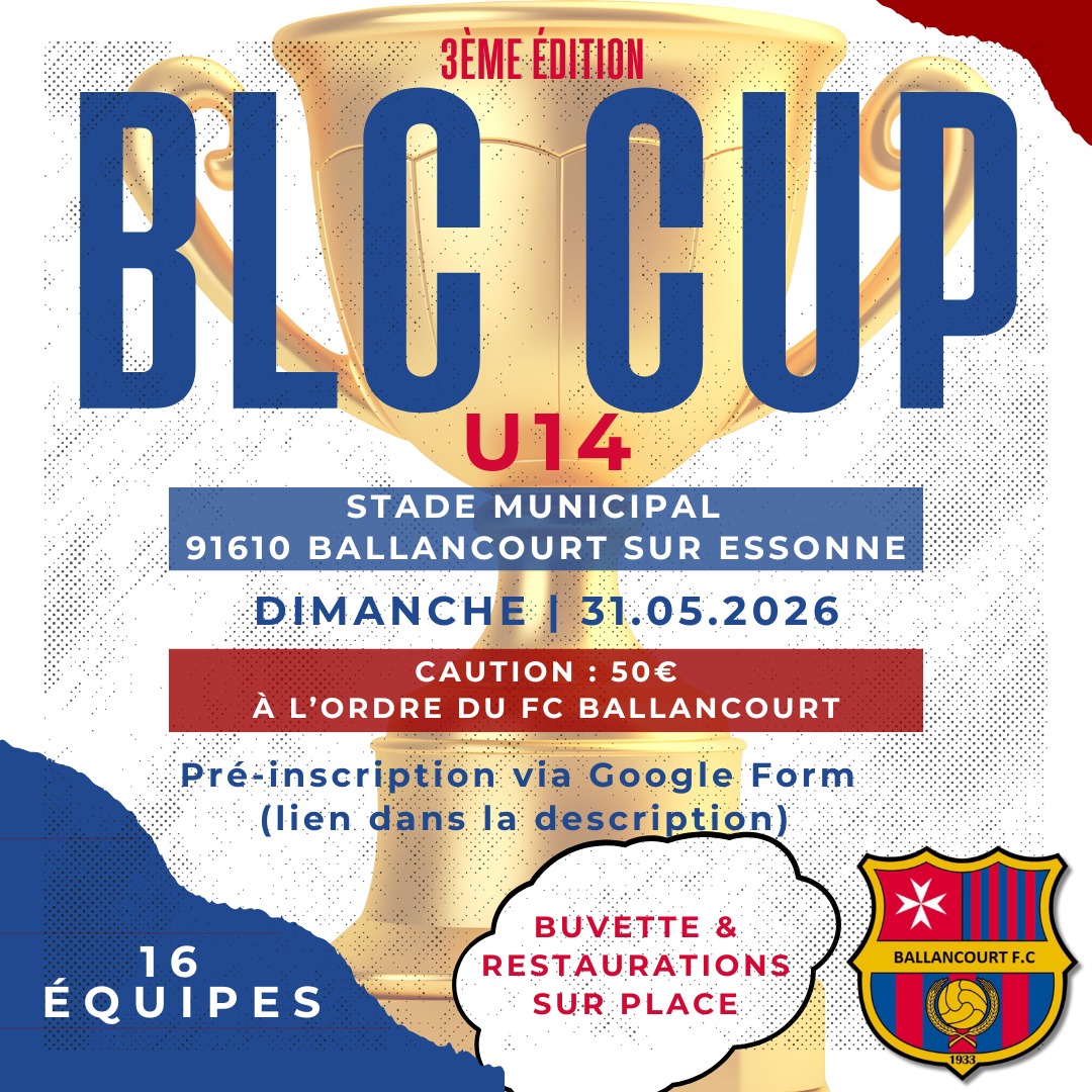 ⚽🔥 BLC CUP 2026 – FC Ballancourt 🔵🔴🔥 Le FC Ballancourt vous donne rendez-vous pour la BLC CUP 2026 ! Un tournoi placé sous le signe du football, de la convivialité et du plaisir ⚽👏 📍 Lieu Complexe sportif de Ballancourt-sur-Essonne ✅ 3 terrains ✅ 1 terrain synthétique ➡️ Des conditions de jeu optimales pour toutes les équipes 🍔🥤 Buvette et restauration sur place toute la journée 🎉 Ambiance familiale et festive garantie 🔵 FOOT À 11 📅 Dimanche 31 mai 2026 ⚽ Catégorie : U14 👥 16 équipes maximum (places limitées) ⚠️ Pré-inscription obligatoire : 👉https://forms.gle/YciadGqbfJVeenn66 💰 Caution : 50 € (Chèque à l’ordre du FC Ballancourt) 📩 Nous vous attendons nombreux pour partager un grand moment de football et de passion ! ⚽🔥