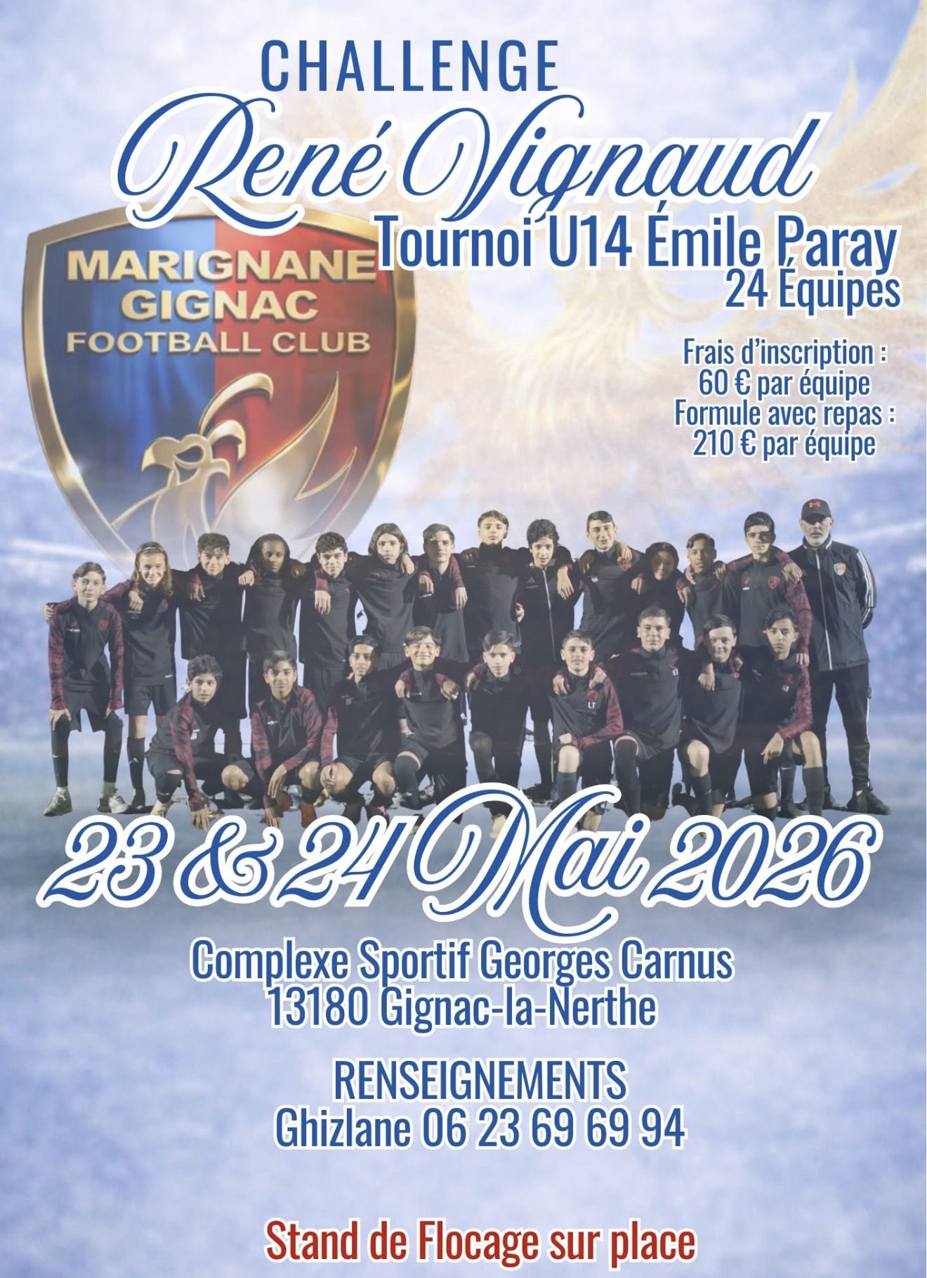 ⚽ Challenge René Vignaud – Tournoi U14 Le Marignane Gignac Côte Bleue Football Club organise le Challenge René Vignaud, un tournoi U14 qui rassemblera 24 équipes sur deux journées de compétition intenses. 📅 Date : 23 & 24 mai 2026 📍 Lieu : Complexe Sportif Georges Carnus 🏙️ Ville : 13180 Gignac-la-Nerthe 🗺️ Région : Provence-Alpes-Côte d’Azur 🏷️ Département : Bouches-du-Rhône (13) 👥 Catégorie : U14 🏟️ Format : 24 équipes – tournoi sur deux jours 🔹 Au programme ⚽ Plateau relevé avec 24 équipes 🏆 Deux journées complètes de compétition 🤝 Tournoi placé sous le signe du jeu, du respect et du fair-play 👕 Stand de flocage sur place 💰 Frais d’inscription • 60 € par équipe • 210 € par équipe avec formule repas 📩 Les clubs souhaitant participer peuvent contacter l’organisateur afin de recevoir la fiche d’inscription officielle du tournoi. 👤 Organisateur Marignane Gignac Côte Bleue Football Club 📞 Contact Ghizlane – 06 23 69 69 94