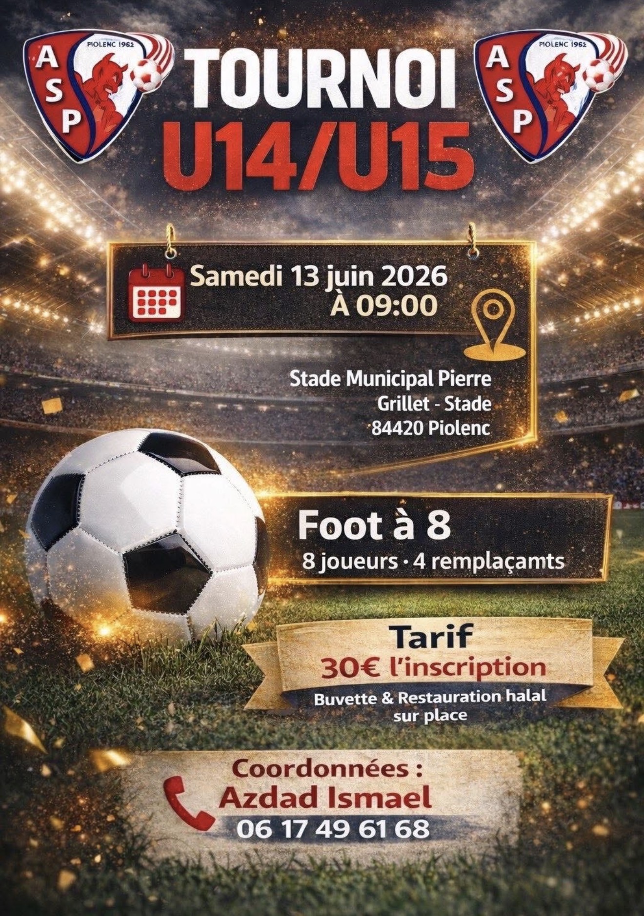 📅 Date : Samedi 13 juin 2026 ⏰ Heure : 09h00 📍 Lieu : Stade Municipal Pierre Grillet 📮 Adresse complète : Stade Municipal Pierre Grillet – 84420 Piolenc 🏙️ Ville : Piolenc 📌 Département : Vaucluse (84) 🌍 Région : Provence-Alpes-Côte d’Azur ⚽ Catégories : U14 / U15 👥 Format : Foot à 8 (8 joueurs + 4 remplaçants) 💰 Tarif : 30€ l’inscription 🍔 Sur place : Buvette & Restauration halal 📞 Contact : Azdad Ismael 06 17 49 61 68