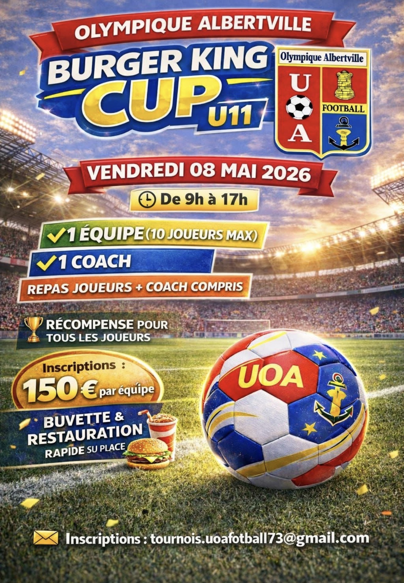 🏆⚽ Burger King Cup U11 – Olympique Albertville ⚽🏆 Un grand rendez-vous du football jeunesse vous attend en Savoie ! 🌟 L’Olympique Albertville organise la Burger King Cup U11 dans une ambiance conviviale, compétitive et festive 🎉⚽ 📅 Date : Vendredi 08 mai 2026 ⏰ Horaires : 9h00 – 17h00 👦 Catégorie : U11 📍 Région : Auvergne-Rhône-Alpes 🏔 Département : Savoie (73) 🏙 Ville : Albertville 📮 Code postal : 73200 🏟 Adresse complète : Stade Municipal, 73200 Albertville, Savoie, France ⚽ Format du tournoi : ✅ 1 équipe (10 joueurs maximum) 👔 1 coach 🍽 Repas joueurs + coach compris 🏅 Récompense pour tous les joueurs 💰 Frais d’inscription : 150 € par équipe 🥤🍔 Buvette & restauration rapide sur place 📩 Contact organisateur : 📧 tournois.uoafotball73@gmail.com 🏟 Club : Olympique Albertville Une journée 100% football, passion et plaisir pour vos jeunes champions ! 🔥⚽🏆